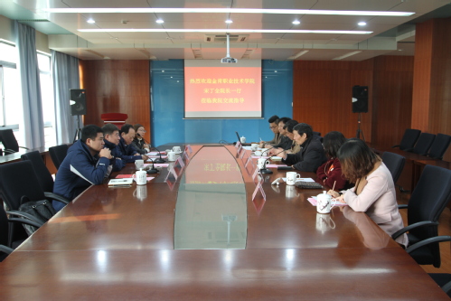 11月19日,金肯职业技术学院院长宋丁全、院党委书记熊仁民一行来我校进行交流考察,学院朱秀林校长、陈家颐副校长、倪筱琴副书记以及相关职能部门的负责人在实训楼会议室会见来宾。
