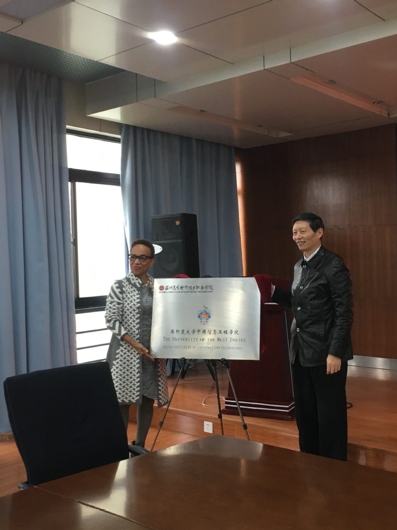 随后,在双方与会代表的见证下,朱秀林校长与Barriteau副校长共同为西印度大学中国信息工程学院牌匾揭牌。