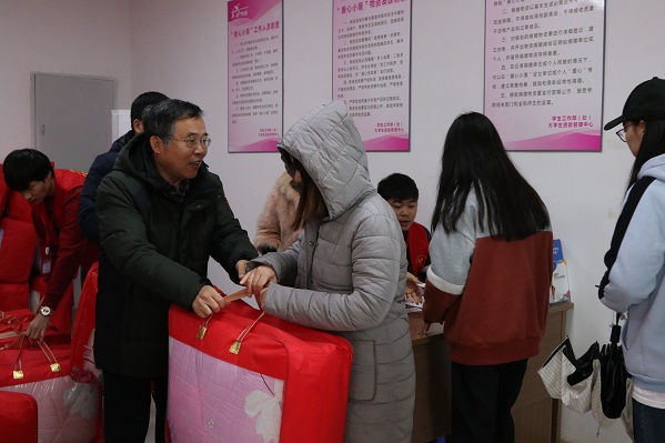 严冬来临,寒意渐浓。为了让家庭经济困难学生感受到学院领导及全院师生对他们的关爱,让寒冷的冬季变得温馨和谐,扎实做好“精准扶贫”工作,确保结对帮扶活动取得实效。近日,在学院徐子良副院长的亲自带领下,学生处邹艳星处长、胡赛书记、周萍主任在爱心小屋对贫困学生开展了“寒冬送温暖”活动,为每一位受助学生发放一床棉被,让贫困学生在寒冷的冬天里感受高博学院的温情和关爱。