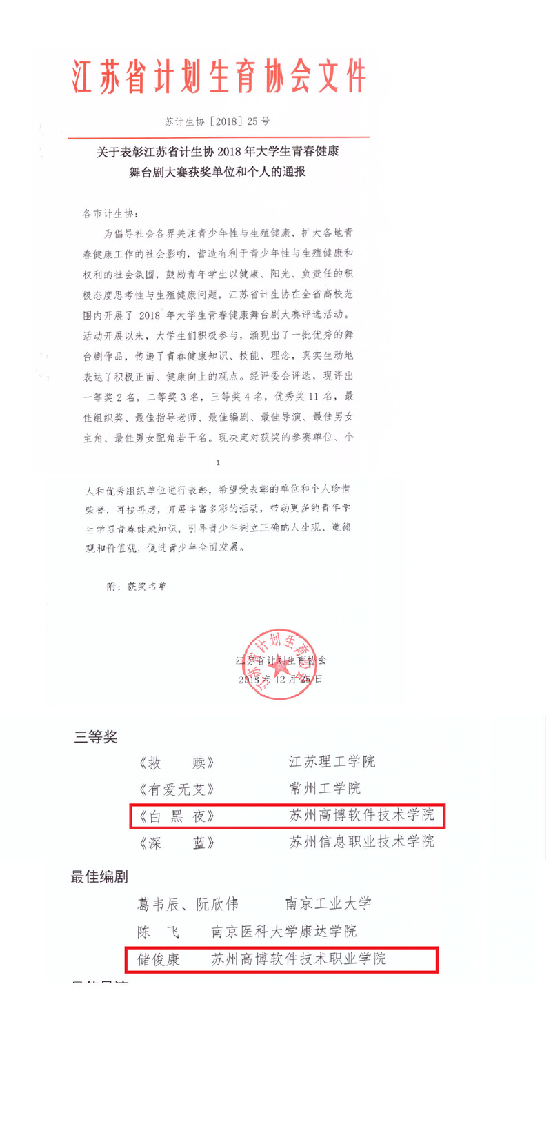 我院在今年开学初选送的青春健康舞台剧作品《白黑夜》荣获江苏省计生协2018年大学生青春健康舞台剧大赛三等,编剧储俊康荣获“最佳编剧”单项奖。