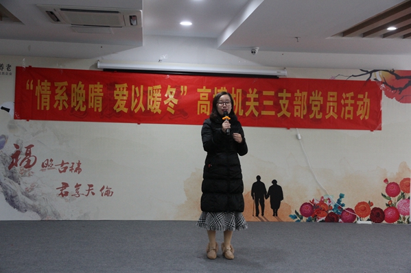 机关三支部组织委员王琴同志作为代表向全体长者以及养老院的工作人员致以节日的问候。参加活动的党员代表和区红十字会的程主任和戴老师以及全体学生志愿者向现场的老人们送上了慰问品和爱心编织。收到志愿者们用心编织的帽子、坐垫和围巾后,所有的长者都特别的感动。