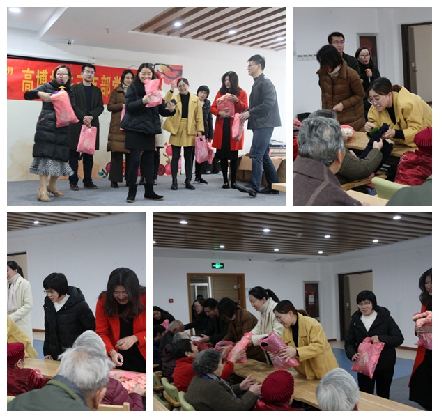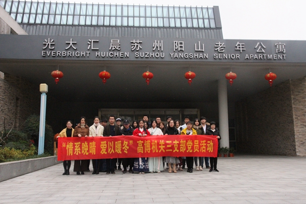 2018年12月21日下午,学院机关第三党支部的党员代表携手院红十字会志愿者,前往苏州市阳山养老院开展主题党员活动。高博师生通过敬老、爱老、尊老的活动形式,进一步弘扬中华民族的传统美德。这次活动得到了苏州市高新区红十字会的大力支持,程飞主任和戴晓雯老师全程参加了活动,还给老人们送上了生活物资。