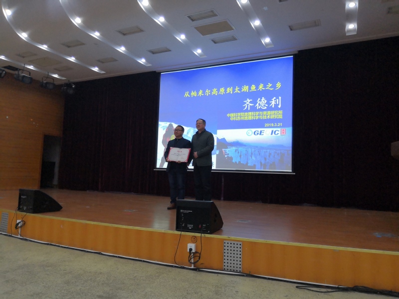 2019年3月21日晚,我院邀请到中国地理学会理事、苏州市地学会常务理事、中科苏州地理科学与技术研究院书记、中国科学院地理科学与资源研究地貌室齐德利博士来校做题为《从帕米尔高原到太湖鱼米之乡》的地学科普报告,近500名学生聆听了齐博士的报告。人文学院张正炎常务副院长出席报告会,并为齐德利博士颁发了“客座教授”聘书。报告会由人文学院吴歧范副院长主持。
