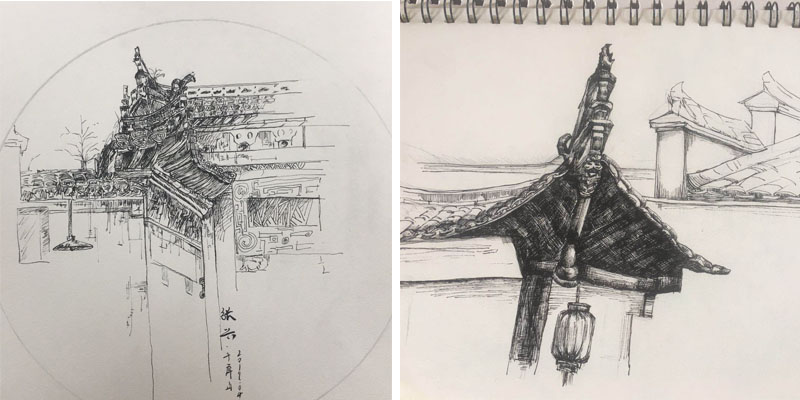 屏山村,一个现代文明影响不大的皖南村落,九曲十弯的吉阳溪,穿村而过;各具特色的石桥,跨溪而建;青砖灰瓦的民居祠堂,依河而筑。经过一夜的休息,精神饱满的学生们第二天一早就开始了写生活动。暮春时节,屏山的云雾缥缈,山色秀美,还有历史悠久的古建筑群都让人沉醉其中。一步一景,一景一画,同学们已然在以专业的眼光进行取景、构思,把皖南特有的村落之美体现的淋漓尽致。