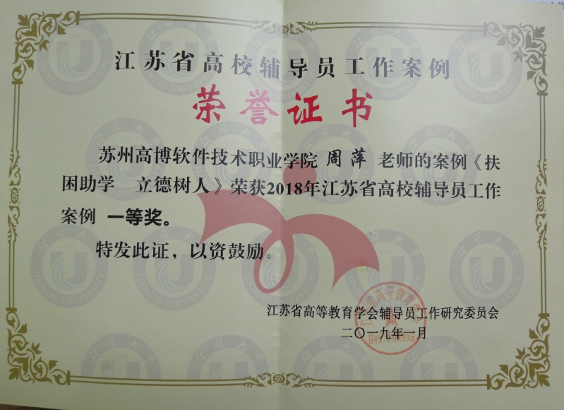 为深入学习贯彻习近平新时代中国特色社会主义思想和党的十九大精神,结合全国全省高校思想政治工作会议精神和《普通高等学校辅导员队伍建设规定》(教育部令第43号)要求,切实加强和改进新形势下我省大学生思想政治教育工作,进一步提高学生教育管理科学化水平,推进辅导员工作队伍专业化、专家化建设,研究探索新时期学生工作的特点、规律、途径和方法,总结与展示学生工作的理论与实践成果,我院积极开展各项辅导员培训和素质能力评比,并在学院辅导员工作案例评的基础上,推荐周萍老师参加江苏省高校辅导员工作案例评比。