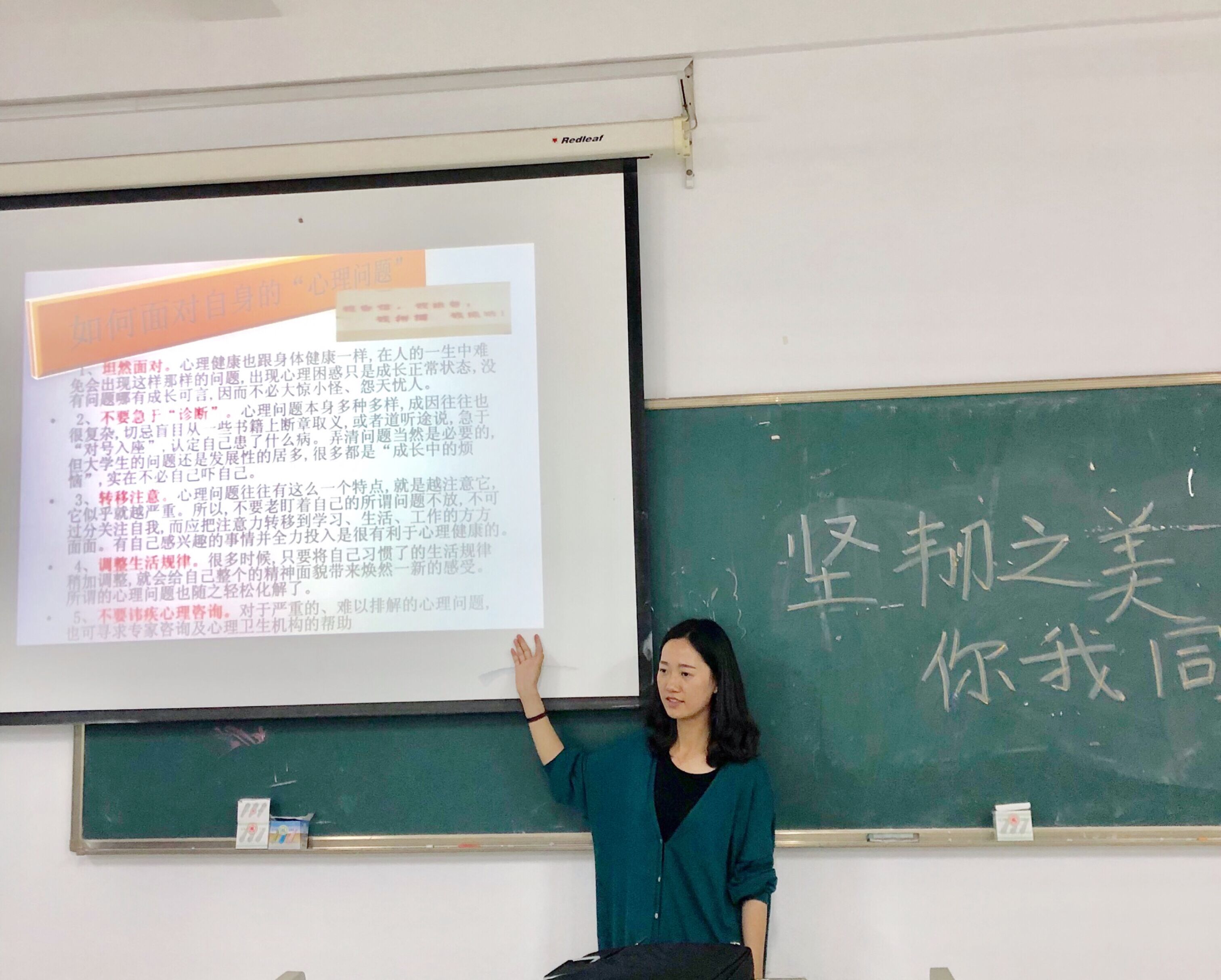 活动之初,何老师以《i自己》微视频作为引入和话语引导,让学生了解“坚韧之美,你我同行”的活动主题。接着,何婷婷老师通过心理健康教育的PPT解说、案例讨论等环节与学生们探讨了影响学生心理健康问题的多方面因素:如了解情绪并掌控情绪、学业与就业困扰、人际交往不适等各种与高校大学生息息相关的心理问题。在接下来的互动交流环节,何老师让学生们思考自己当下所面临的心理问题,在便利贴上写下鼓励自己的话贴在讲台的寄语墙上,何老师从中随机选取几段话和大家分享以共勉。活动最后,何老师对本次心理班会做出总结,并呼吁大家一定要关注心理健康,要以一种豁达的胸怀和安然的态度去处理问题。至此,本场心理健康教育活动在频频鼓掌中圆满结束。