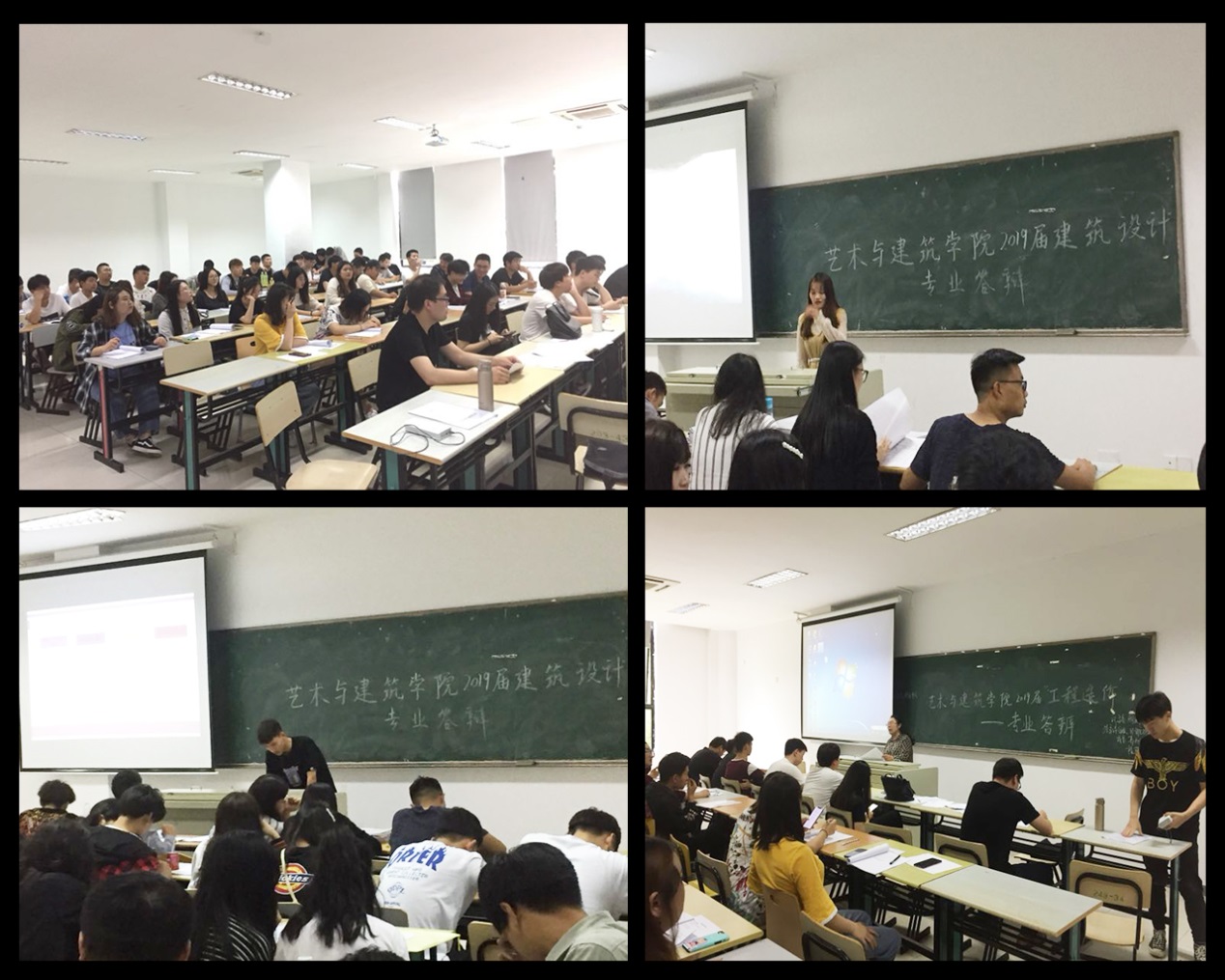 上午9点,答辩会正式开始,整个答辩分为9组进行,答辩现场严格履行我院毕业生论文答辩程序。首先,参加答辩的学生在规定的时间内围绕自己的作品和论文进行阐述,之后答辩评委对该同学的毕业设计和论文进行提问,学生认真作答,并仔细记录各位评委提出的宝贵意见,各答辩委员根据自己的专业判断为每位学生进行评分并填写相关表格。