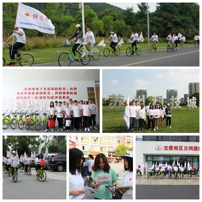 为呼吁更多人关爱老人、服务老人,重视对老年人的健康和养护照顾,我院红十字会志愿者们印发了项目宣传材料,在科技城开展了绿色骑行宣传,深入社区、学校和街道派发宣传资料,学生身着“博爱青春”暑期实践T恤,带着小分队的宣传旗帜和材料,在科技城形成了一道亮丽的风景线。