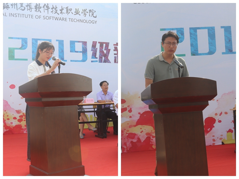 左:新生代表罗靖涵同学发言;右:教师代表李月峰副教授发言