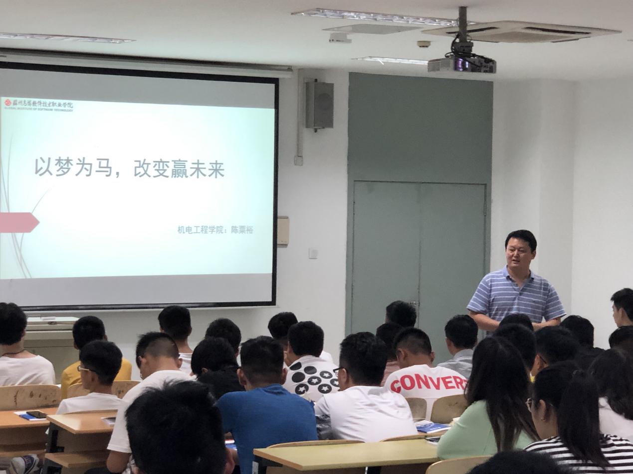2019年9月8日,机电工程学院党总支副书记陈粟裕以“以梦为马,改变赢未来”为主题,给同学们带来了一场“领航•开学第一课---新生入学班会”的思想教育。由机电工程学院学生党支部书记赵雪飞担任主持。