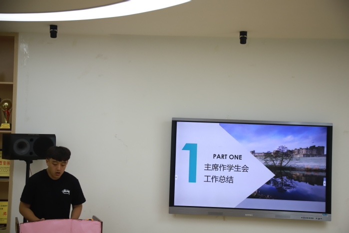 大会伊始,学生会主席熊思博首先对学生会一年以来的工作进行总结,并宣布学生会换届大会的各项议程。