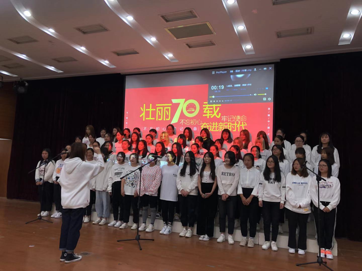 为庆祝中华人民共和国成立70周年,讴歌新中国70年来的光辉历程和伟大成就,我院学生会、艺术团于10月17日组织2019级全体新生开展了“壮丽七十载·奋进新时代”大合唱活动。