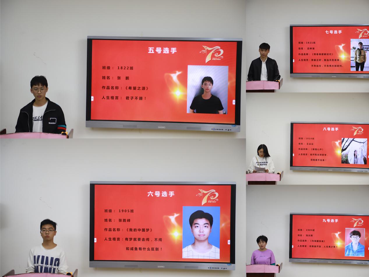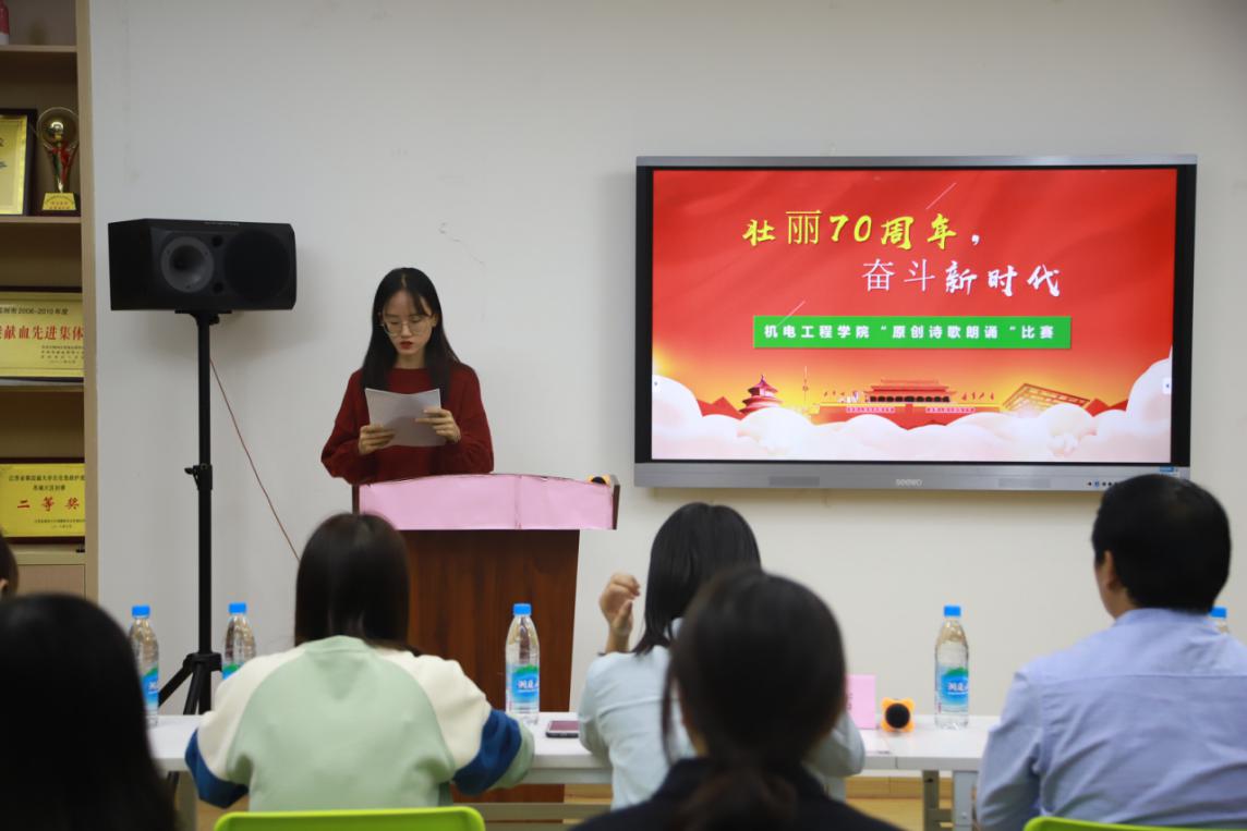 为庆祝新中国成立70周年,弘扬伟大的爱国主义精神,提高大学生的人文素质和道德情操,10月16日晚6:30,机电工程学院团委在青春健康俱乐部举行了“壮丽七十年·奋斗新时代”原创诗歌朗诵比赛。通过此次复赛,我院将选拔出两位获胜选手代表机电学院参加学校的朗诵比赛总决赛。