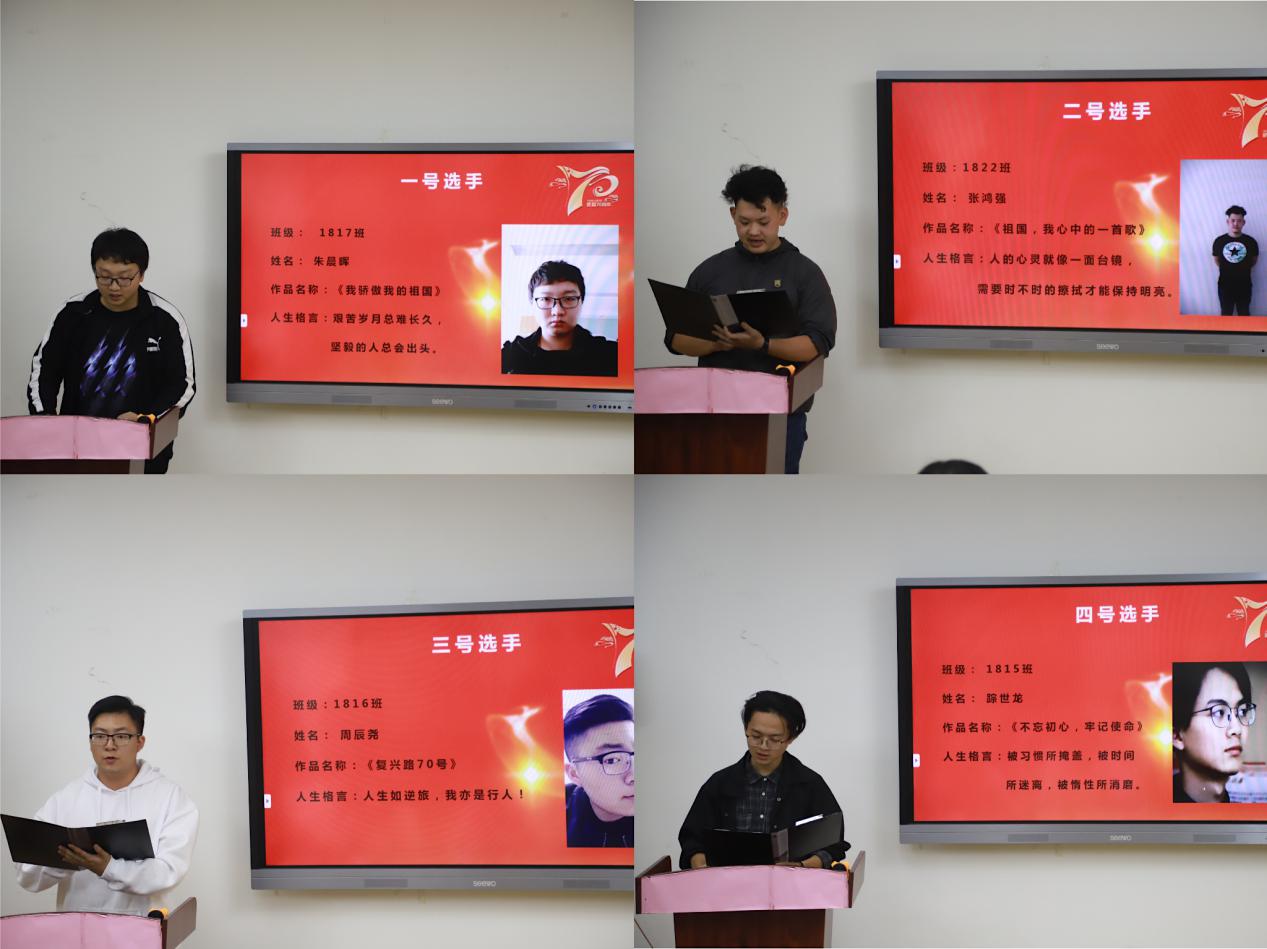 经过综合的评比,最终1816城轨班周辰尧、王云云两位同学脱颖而出,将代表机电工程学院参加校级“爱国爱校”主题朗诵比赛总决赛。