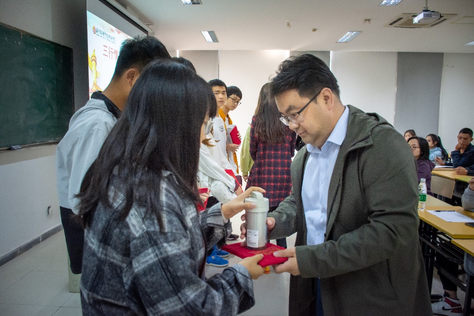 本次比赛共评选出一等奖1名,二等奖2名,三等奖3名,优胜奖8名,为表彰先进,信息与软件学院于10月21日下午举行了“三行情书”活动颁奖仪式,学院党总支副书记郑兰松老师,分团委书记顾笑老师,辅导员江鑫老师担任颁奖嘉宾,信息与软件学生会及青年学习社所有成员参加了颁奖仪式。