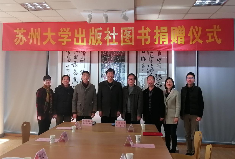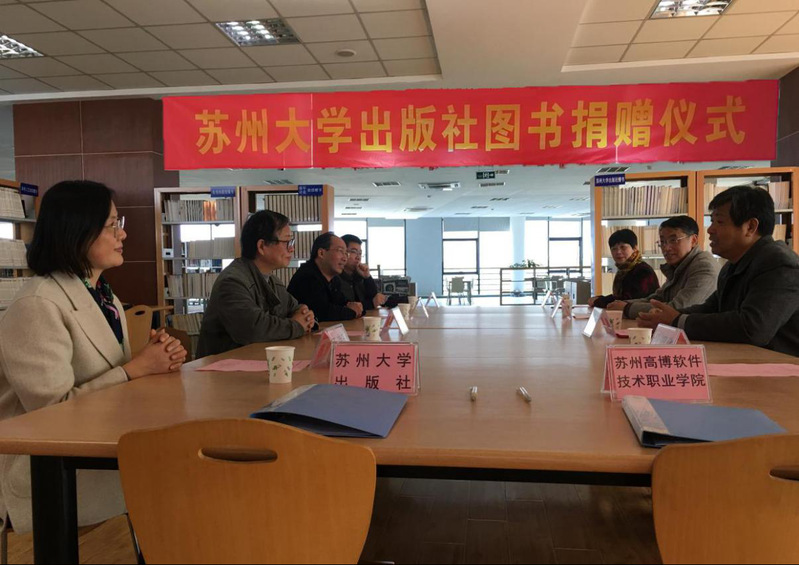 2019年12月4日上午,苏州大学出版社图书捐赠仪式在苏州高博软件技术职业学院图书馆四楼阅览室举行。苏州大学出版社盛惠良社长、朱绍昌副社长、办公室王建珍主任、营销部顾清主任,高博学院陈家颐副校长、张建初副校长、资产与实验室管理处耿明华处长、图书馆钦春英副馆长参加了本次图书捐赠仪式。捐赠仪式由张建初副校长主持。