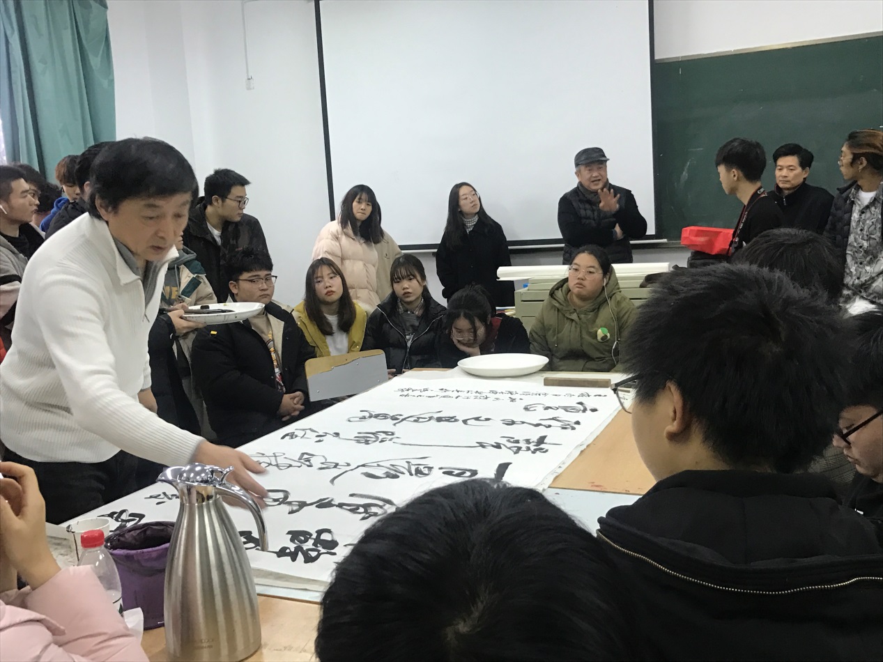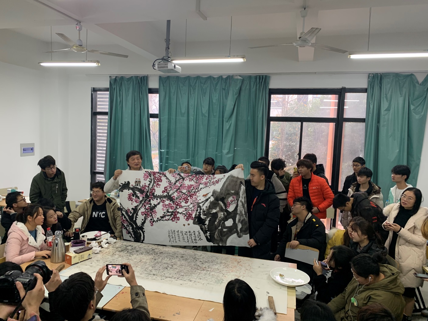 廖军教授从中国画基础知识,我国传统绘画的特点与魅力,向同学们传授自己多年来绘画创作的经验。廖军教授指出国画创作要做到心中有画,落笔无悔。从布局一块墨色太湖石开始到勾花枝、点花托、画梅花麻雀等步骤的逐渐完成,一方太湖石、一树梅花、三只麻雀在廖军教授的大笔落墨和小心收拾中逐渐清晰,一幅《迎春图》栩栩如生的展现在大家面前。廖军教授现场用草书题古诗《早发白帝城》,落笔如行云流水,笔酣墨饱,一气呵成。