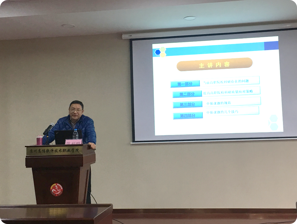 随后,苏州经贸职业技术学院科技产业处处长陈福明教授以“高职院校教师科研项目申报技巧”为题作培训讲座,向参会教师分析当前高职院校科研存在的问题,提出高职院校科研质量应对策略,讲解申报课题的规范,传授申报课题的技巧,并与我院教师进行了热烈交流。