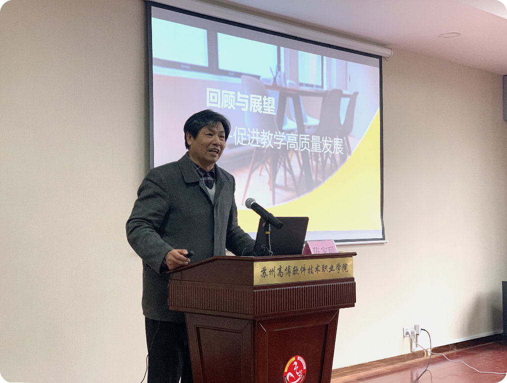 首先,学院副校长陈家颐教授以“促进教学高质量发展”为主题作报告,全面回顾了2019年的教学工作,在充分肯定本年度教学工作的同时也指出我校人才培养模式上尚存的问题,进一步明确了在今后的专业建设工作中应注重的专业评价标准。会上,陈校长还对2020年教学工作进行了展望,要求专业及管理机制与市场对接速度需更快,课程含金量和课堂教学水平需更高,学校、教师和学生社会竞争力需更强。为实现教学高质量发展,陈校长提出三个建设思路:一是完善内部治理体系,进一步解放二级学院的生产力;二是优化专业群格局,进一步提高专业吸引力和适应力;三是着力打造教学标杆,进一步锻造学校核心竞争力。