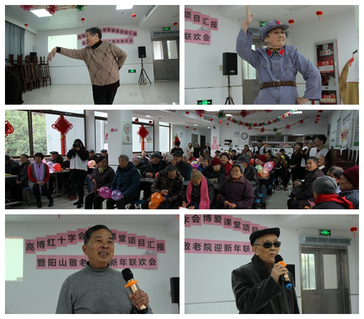 随后是进行联欢表演,志愿者精心准备了《兔子舞》,身着卡通玩偶服装来到爷爷奶奶中间互动,逗得老人们开心不已、太极表演和合唱《我的中国心》博得了老人们阵阵掌声,非洲鼓伴奏的《安和桥》让老人们耳目一新,纷纷喊着再来一首,诗朗诵表达了全体志愿者对敬老院爷爷奶奶的爱意以及希望积极用自己的实际行动来陪伴老人的决心;阳山敬老院长者们也是多才多艺,84岁的张惠仙奶奶表演舞蹈《太湖美》和《红色娘子军》,舞姿优美,表演时随着音乐时而柔美,时而英姿飒爽;金玉堂和顾增诗两位爷爷是阳山敬老院公认的“歌王”,两人演唱的《革命人越来越年轻》和《我和我的祖国》,曲调优美,包含情谊,博得大家阵阵掌声。