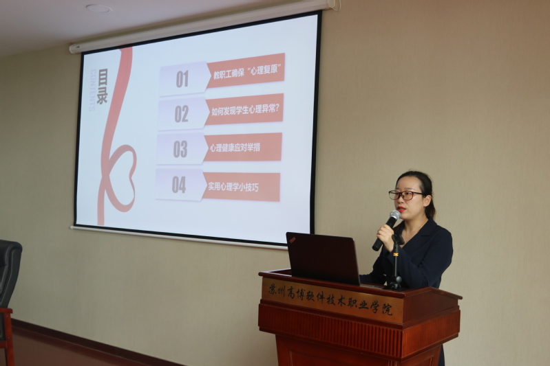 为更好迎接学生返校,做好学生心理复原工作,学生处副处长王琴从心理复原、如何发现学生心理异常、心理健康应对举措、实用心理学小技巧四个方面为为全体教职工讲解。教职工需要识别学生的心理问题即一般心理困扰、严重心理问题、精神疾病与障碍,及时做好个人自助、二级学院帮助、心理中心帮助、精神中心&社会资源帮助的三级网络四步应对措施。王老师教会大家几个使用心理学小技巧,通过放松训练、放下抱怨、培养兴趣、放下手机等方式,克服焦虑、紧张、不适等心理问题,引导大家保持积极乐观心态和决胜疫情的信心。
