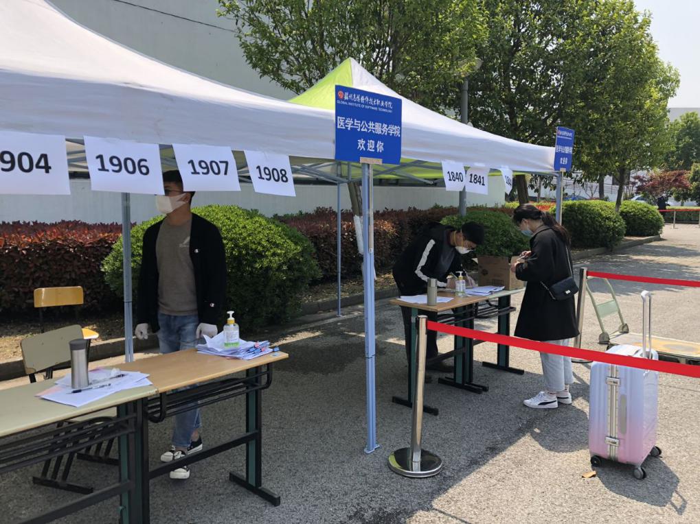 4月13日,医学与公共服务学院迎来了2020年春季第一批返校复学的学生。历经了“超长待机”的寒假,阔别了数月的师生终于校园重聚了!面对开学第一天的“大考”,学院上下卯足了劲。