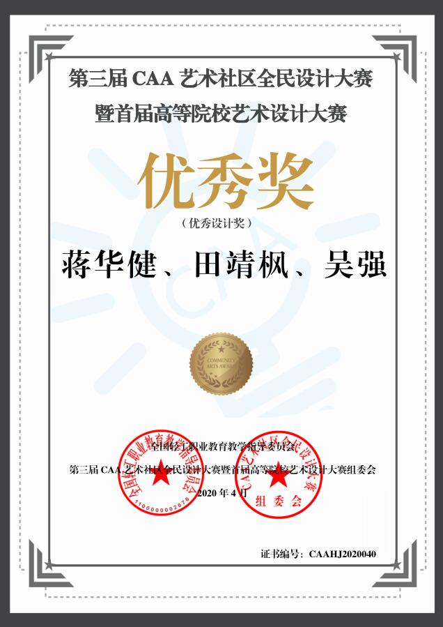 4月20日,由中国轻工业联合会(全国轻工职业教育教学指导委员会)、金浦九号苏州设计小镇、苏州上久楷丝绸科技文化有限公司、苏州蒋喜美石坊玉雕工作室联合主办的——第三届CAA艺术社区全民设计大赛暨首届高等院校艺术设计大赛圆满落下帷幕。由艺术与建筑学院选送的《苏•舍概念性牛肉米粉店》设计作品荣获优秀奖(详见图1-1作品、图1-2证书);施建平、朱徐庆、张金威、孙雅君荣获优秀指导教师奖(详见证书图2);朱徐庆、黄鹏琦、荣佳敏、孙煜坷、许卓豪等的6项作品荣获入围奖(详见证书图3)。