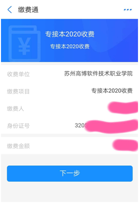 ③扫码后会自动跳出缴费信息:缴费人姓名、身份证号、缴费金额,确认信息无误之后点击下一步
