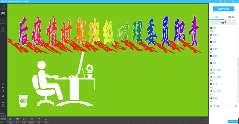 班级心理委员是学校心理健康三级网络重要组成成员,为进一步帮助广大学生增加心理弹性,更好的面对复学后对疫情的担心害怕以及对封闭管理不能外出的不满情绪等,学生健康教育中心特别组织了一次班级心理委员培训,帮助班级心理委员掌握基本的方法和技术在班级中关心、帮助有需要的同学,并及时识别和上报有异常心理问题的学生。本次培训采用腾讯直播的形式,通过理论宣讲、知识问答、工作职责考核等环节,帮助班级心理委员进一步增强胜任力。