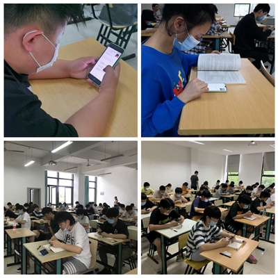 考试第一天,组织开展的是《毛泽东思想和中国特色社会主义理论体系概论》与《公共英语2》两门公共基础课程考试。由于部分学生受疫情影响未返校,为确保全体学生能在统一时间段内正常进行考试,学校决定采用“超星在线考试系统”利用学生手机等移动终端进行在线考核。在校的学生集中组织进入教室、不在校的学生各自在家中,同一时间开始在手机上进行考试。学校同时也周密安排线下+线上的监考工作,线下监考教师负责在考场监督学生各项考试行为,线上监考教师在网上实时监控并警示学生答题情况、切屏次数等事宜,确保了考场秩序和考试的公平公正。
