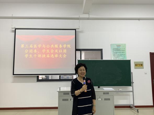 2020年9月18日中午12:30,医学与公共服务学院第三届分团委、学生会及社团学生干部换届大会在4-212教室召开。出席本次大会的有医学与公共服务学院名誉院长薛小玲教授、章晓莉副院长、学工办主任赵洪鹏老师、分团委书记贺茜老师,第二届分团委、学生会、社团学生干部,来自2019级各班学生代表以及参加竞选的学生会成员。