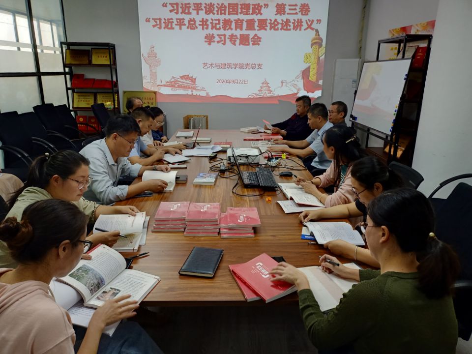 2020年9月22日12:40,艺术与建筑学院党总支在学院党员活动中心开展关于“习近平谈治国理政”第三卷和 “习近平总书记教育重要论述讲义”学习专题会。