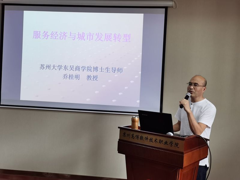 2020年10月14日下午,名师讲堂第三期“服务经济发展与城市转型”讲座在我校215学术报告厅举行,讲座邀请了苏州大学东吴商学院博士生导师乔桂明教授主讲,国际商学院的师生代表参加并聆听乔教授的精彩演讲。
