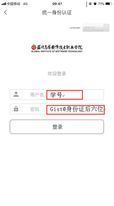 登录方式一:如图3在【学校/单位】一栏输入【苏州高博】(学校名称简写),选择下方弹出的学校名称,进入统一身份认证页面如图4,在【用户名】一栏输入学号;在【密码】一栏输入密码(初始密码:Gist@身份证号后6位)。