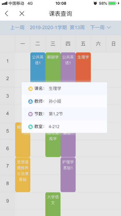 如图6在首页的服务中心点击【课表查询】,进入学生个人课表页面如图7,课表是周次课表,可以通过下拉箭头选择相应的周次查看课表,点击其中的某一课程会弹出相应的任课教师、上课教室等具体信息,如图8。
