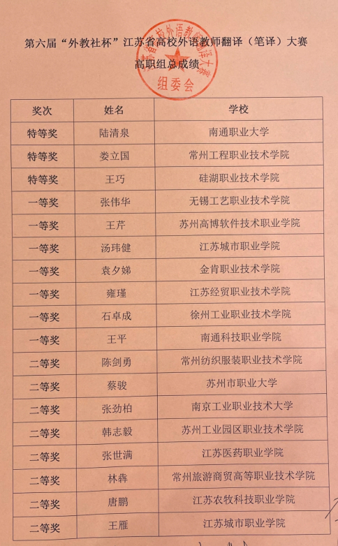 11月20日-21日,第六届“外教社杯”江苏省高校外语教师翻译(笔译)大赛在常州工学院举行。高博外语教学团队王芹和郑颖超老师认真备赛、积极参赛、稳定发挥,经过激烈的复赛角逐,勇闯决赛,成绩优异,分获高职组一等、二等奖项,获奖数量位列江苏民办高职院校首位。