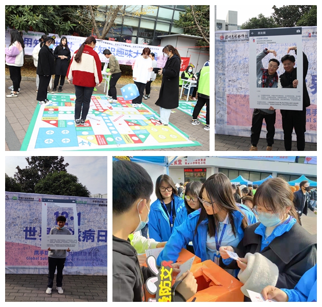 12月1日中午,学生健康教育中心围绕今年的主题“携手防疫抗艾 共担健康责任” 在学校食堂广场举行了“12.1世界艾滋病日”广场宣传活动,琳琅满目的宣传纪念品、憨态可掬的布朗熊、充满童趣的真人飞行棋……吸引了全校师生的目光。