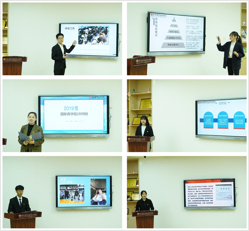答辩会上,竞选者按照抽签顺序依次上台作自我陈述或班级展示,各候选人分别从思想引领、专业学习、社会实践等方面介绍了自身情况,分享他们在校生活点滴经历和成长感怀,展现出高博学子的责任担当和优秀品质。候选先进班集体代表则重点展示了各自班级的组织架构、班风建设、学风建设和活动开展等,多角度展现了班级的青春活力。