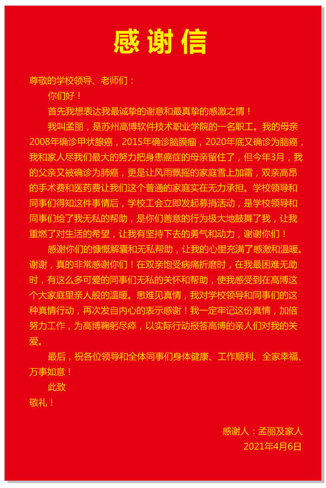 据了解,孟丽老师的母亲2008年确诊甲状腺癌,2015年确诊脑膜瘤,2020年底又确诊为脑癌,多年的医疗费耗尽了全家所有的积蓄。而今年3月,其父亲又被确诊为肺癌,更是让本已困难的家庭雪上加霜,双亲高昂的手术费和医药费让他们这个普通的家庭实在无力承担。学院工会得知消息后积极行动,于2021年3月30日向全校教职工发出倡议,采取自愿原则,为孟丽一家进行爱心捐款。无论是普通教职工还是校领导都伸出援助之手,短短的几天时间里,共筹集款项39685.21元,充分体现了“学校一家亲,患难显真情”的高博文化。