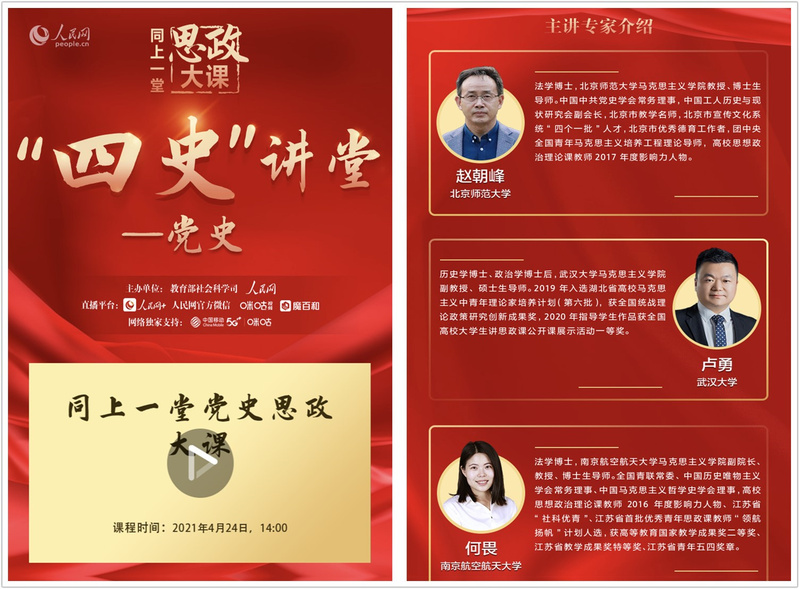 本次课程由北京师范大学马克思主义学院教授赵朝峰,武汉大学马克思主义学院副教授卢勇,南京航空航天大学马克思主义学院教授何畏主讲,从“马克思主义与中国共产党的百年辉煌”“中国共产党与中华民族的伟大复兴”“中国共产党革命精神形成与传承的百年历程”这三大主题,为同学们梳理了中国共产党百年来的发展历程,展示了新中国建设取得的举世瞩目的成就和在这一过程中体现出的革命精神。各位主讲嘉宾细致入微的讲解,在全校青年学生中引起强烈反响与深思。