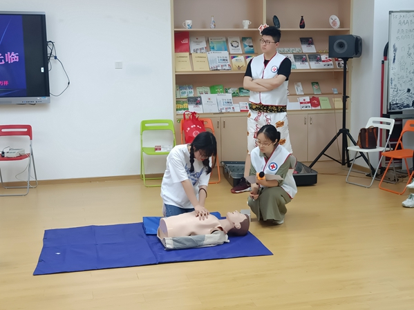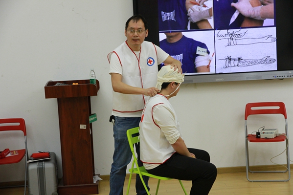 在“5.8国际红十字日”进行校园广场宣传时,校红十字会的志愿者进行了初级救护员的报名招募,学生报名积极性高涨,一部分表示想要学习一些救护知识用于帮助自己和家人应对突发情况,另一部分学生则认为掌握了急救技能可以更好参与志愿服务工作。今年首期培训班50个名额一下子就被抢完了。培训当天,大家也早早来到了培训教室。整个培训中,大家认真聆听吉医生讲解急救的意义,并且现场演示了几种急救包扎的方法;崔婧婧护师为大家现场演示了心肺复苏的规范操作。