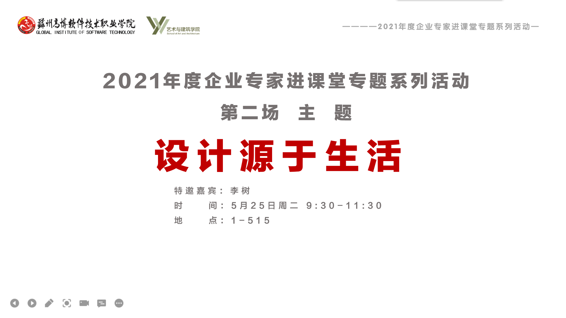 5月25日上午,艺术与建筑学院环境艺术设计品牌专业暨优秀教学团队开展了“2021年度企业专家进课堂专题系列活动”的第二场。本次活动特邀苏州中特装饰设计工程有限公司项目经理李树先生,环境艺术系专业全体教师、2019级全体同学、部分2020级同学聆听了此次讲座。活动由院长助理兼环艺系主任江水明主持。