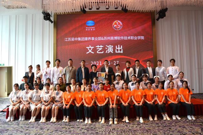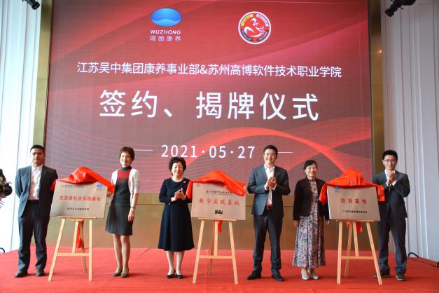 2021年5月27日下午,苏州高博软件技术职业学院与江苏吴中集团康养事业部校企合作签约、揭牌仪式在瑞颐康养中心三楼宴会厅举行。江苏吴中集团康养事业部总经理费晓勇先生、副总经理袁富裕先生、总经理助理陶冲先生、苏州高博软件技术职业学院张建初副校长、苏州高博软件技术职业学院校长特别助理、医学与公共服务学院名誉院长薛小玲教授、医学与公共服务学院院长孙小娅教授、医学与公共服务学院副院长章晓莉教授、苏州高博软件技术职业学院校企合作办公室马浩主任出席活动。