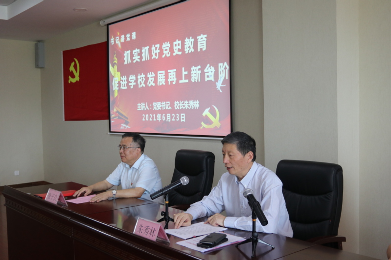 表彰大会结束后,党委书记、校长朱秀林同志以《抓实抓好党史教育,促进学校发展再上新台阶》为题,结合党史学习教育,为全体师生党员带来了一堂精彩的党课。朱书记指出,对高博学院而言,初心就是立德树人,培养德智体美劳全面发展的社会主义建设者与接班人;使命就是建设应用型高水平有特色高职院校,为国家培养应用型、技术技能型人才。立足新发展阶段,学校要乘势而上,紧紧围绕中长期发展规划(2018-2035年),统筹规划教学、科技与社会服务等各方面工作,全面优化专业布局,全面提高内涵建设质量,全面增强服务区域经济社会发展能力,全面提升综合办学实力。