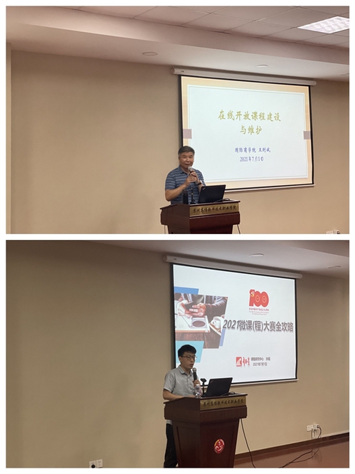 随后,是本次会议的第二个专题“课程建设”。本专题中,首先由国际商学院王则斌院长作“在线开放课程建设与维护”的专题报告,他介绍了在线开放课程建设背景,为教师厘清了“微课”、“慕课MOOC”和“翻转课堂”三个概念,分别从6个方面重点介绍了“如何开发一门在线开放课程”。他还指出,课程的上线与维护同样重要。接着,由超星课程研究中心孙磊主任为大家讲解“2021年微课大赛全攻略”,他详细的从微课设计全过程、教师自己如何做微课、第三视角看微课和2021年微课比赛注意事项四个方面进行了讲述。通过王则斌院长和孙磊主任的分享,我校教师在线上开放课程建设方面有了更深的认识,对微课比赛规则有了深刻的了解。