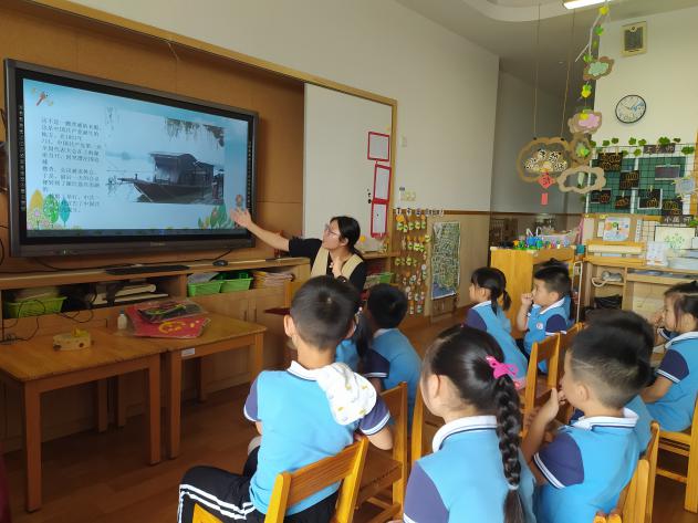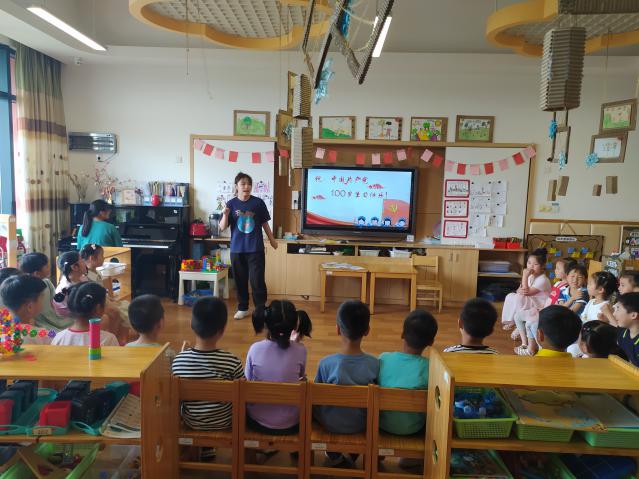 参观完毕,团队成员进入班级与小朋友进行课堂互动。团队成员给小朋友进行党史知识的讲解,教小朋友唱《祖国祖国我们爱你》。小朋友们跟着钢琴的旋律歌唱,一起祝福亲爱的中国共产党百岁生日快乐,表达对祖国母亲的热爱。