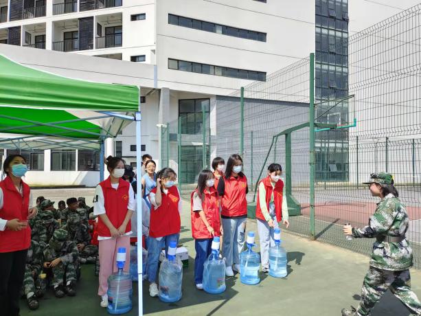 休整期间,志愿者们热情地给同学和教官送水,表达对参训同学的鼓励以及对教官的由衷敬佩。在学长学姐的鼓励下,参训新生被晒得通红的脸上多了几分坚定和勇敢。本次军训慰问虽然只有短短两个小时,但却实实在在让新生感受到医学与公共服务学院大家庭的温暖,也为他们接下来的军训生活提供不竭的精神动力。