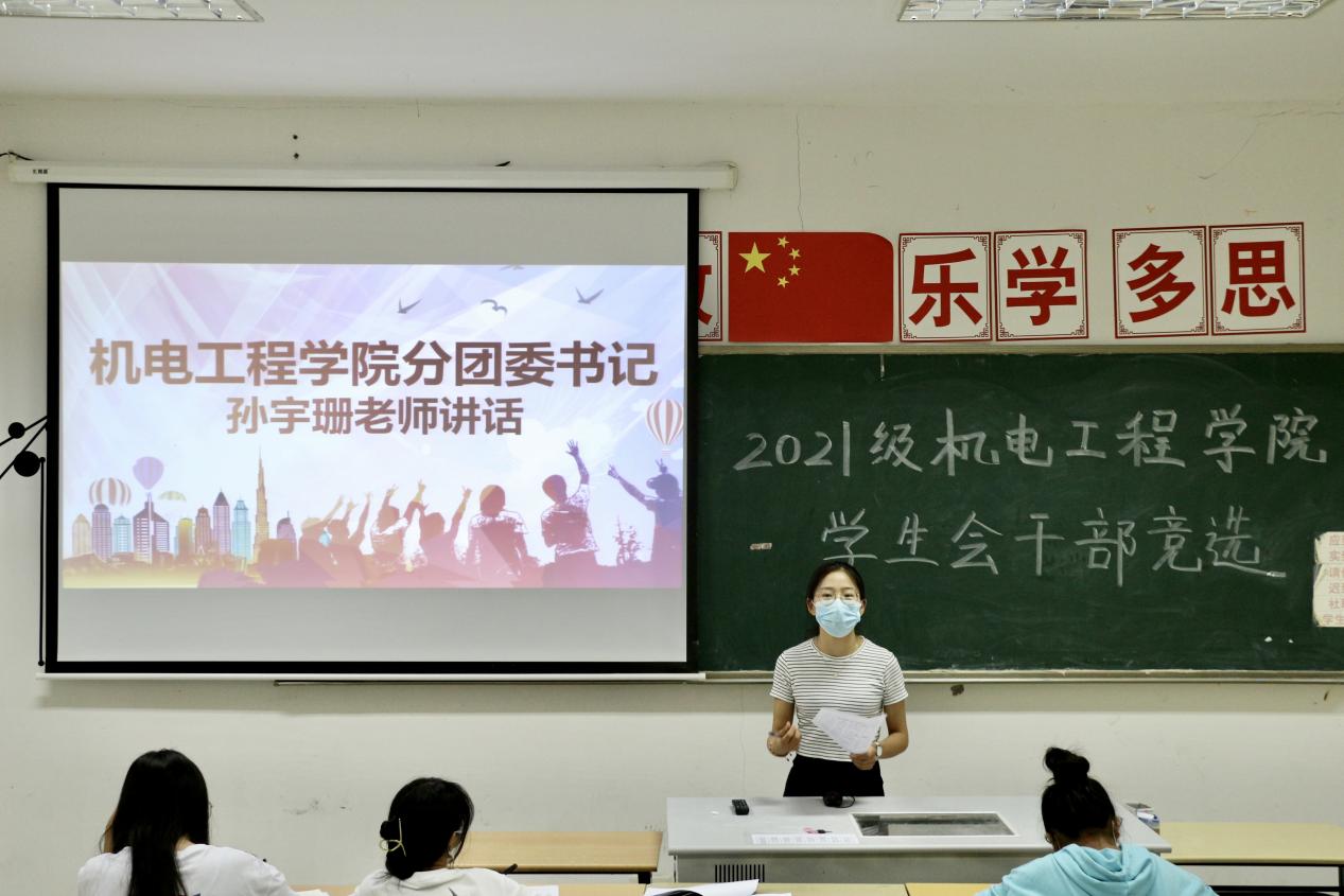 大会最后,机电工程学院分团委书记孙宇珊老师对学生干部提出以下几点要求:第一,保持积极心态,不要轻易被挫折打倒;第二,明确岗位认知,做好自己的本职工作;第三;珍惜当下,实事求是,脚踏实地,不要抱怨,争做一名有作为、有担当的学生干部。