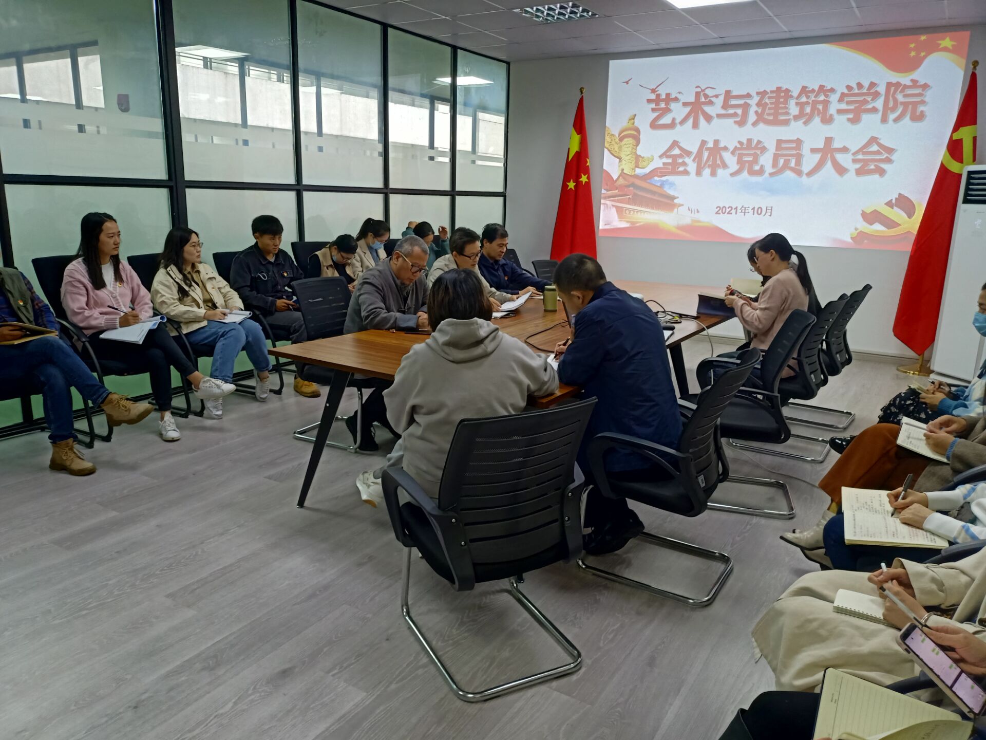 10月20日中午,在艺术与建筑学院党员活动室召开艺术与建筑学院全体党员大会,三十一名党员全部到会参加,部署学院下阶段党建工作任务。会议由党总支书记、副院长施建平教授主持。