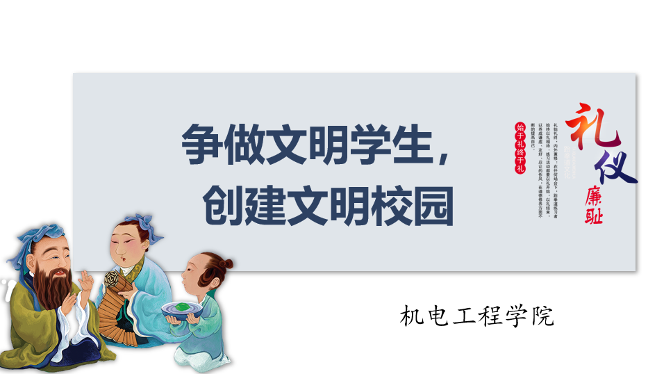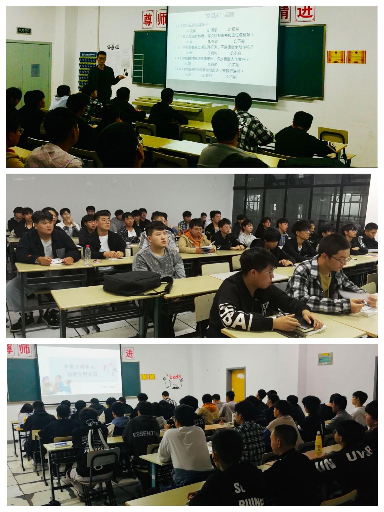 为积极响应学校“请党放心,强国有我”主题系列活动,帮助学生增强文明礼仪知识、树立文明礼仪意识、践行文明礼仪行为、养成文明礼仪习惯,促进学生身心健康发展。经过机电工程学院大一辅导员杜相锋老师和周磊老师认真探讨和积极准备,于2021年10月20日--10月27日在晚自习教室开展了机电工程学院“争做文明学生,创建文明校园”主题教育班会,共计8场。采用小班化、互动形式,辅导员发挥引领作用,促进学生积极参与主题教育班会,学会思考、提升文明礼仪素养、制定学习目标、激发学习主动性。